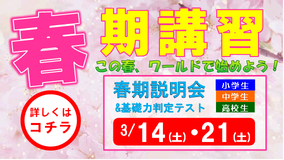 新小5〜新小6 新中1〜新中3 新高1〜新高2 春期講習生募集開始! 春の進学応援キャンペーン実施中! WEB先行予約受付中! 詳しくはコチラ ▼2026 2.3 新小5、新小6 新中1〜新中3 新高2〜新高3 新入塾生募集中! 春の進学応援キャンペーン実施! WEB先行予約開始! 詳しくはコチラ ▼2025 11.25 冬期講習生募集! WEB予約受付中! 詳しくはコチラ 2024年 特別企画実施中! 対象:小5〜中2 冬期講習費半額! 冬期講習参加5大特典! 詳しくはコチラ プレ冬期講座(無料) 対象:小5〜中3 期間:12/17〜23 ▼2025 7.2 夏期講習生募集開始! 7月22日(火)スタート! 小学5年生〜6年生 中学1年生〜3年生 高校1年生〜3年生 WEB予約受付中! 先着5名 講習費半額! 詳しくはコチラ ▼2025 3.1 新小5〜新小6 新中1〜新中3 新高2〜新高3 春期講習生募集開始! 春の進学応援キャンペーン実施中! WEB先行予約受付中! ▼2025 2.1 新小5、新小6 新中1〜新中3 新高2〜新高3 新入塾生募集中! 春の進学応援キャンペーン実施! WEB先行予約開始! |